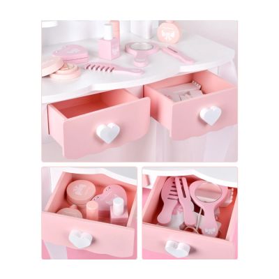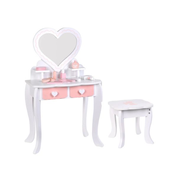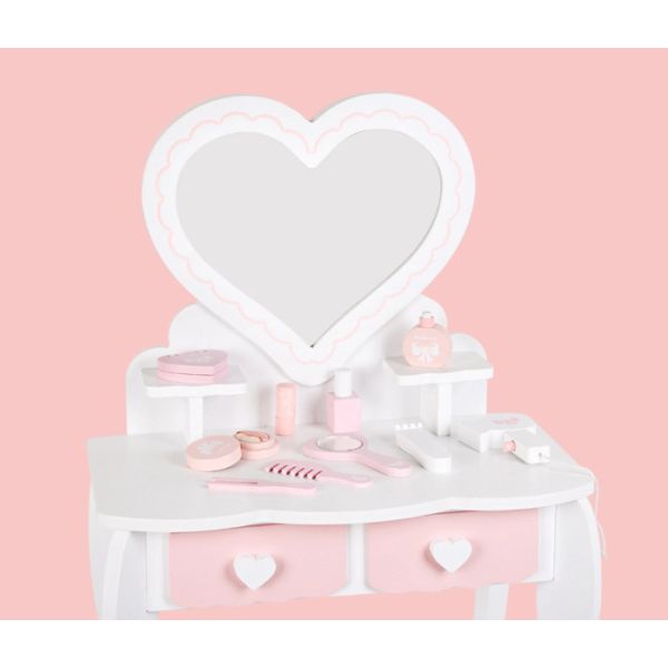 Set čini stočić sa ogledalom, mini stolica ali zanimljivi drugi dodaci poput:češljića, parfema,fena za kosu....