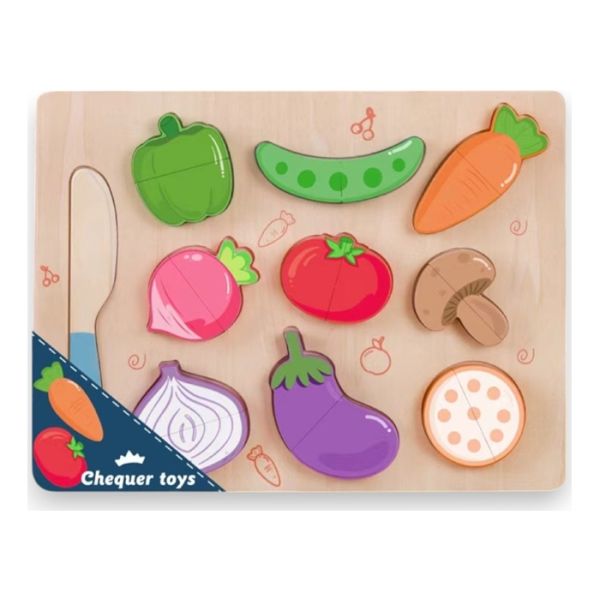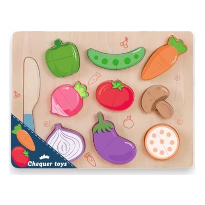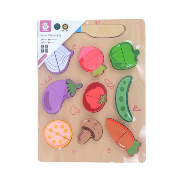 Set čini različito povrće koje se može prepoloviti, a spojeni su uz pomoć čičak trake. U setu je i drveni nožic uz pomoć koga se lakše odvajaju elementi i drvena tacna kao postolje. Uz pomoć ove igre deca upoznaju povrće, cjelinu, polovinu.