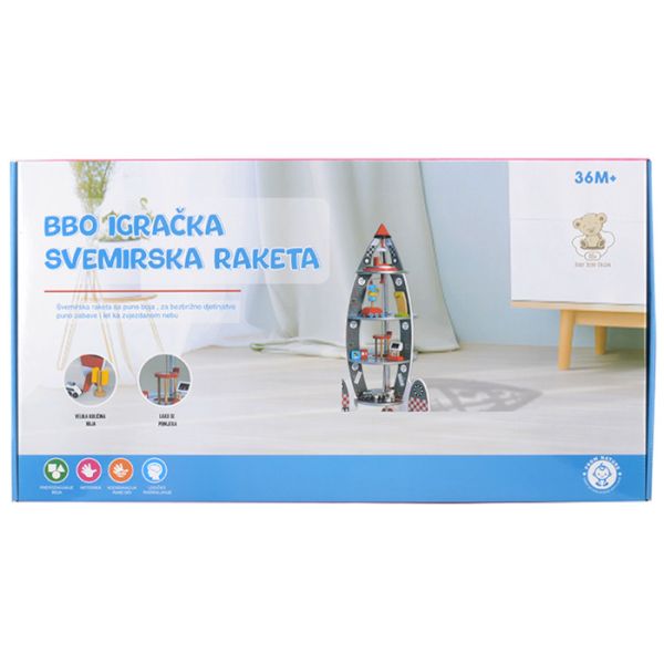 Zanimljiva BBo igračka svemirska raketa, drvena igračka namjenjena je djeci starijoj od 36 mjeseci.