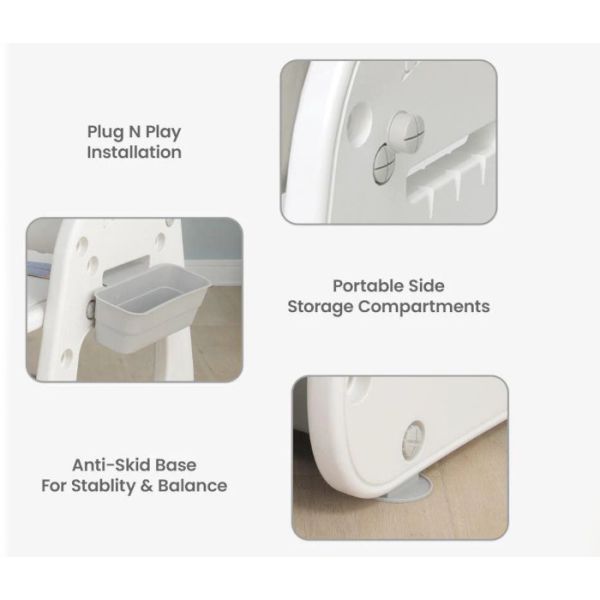 • Sa obje strane stola nalaze se lako odvojive posudice a ispod stola se nalazi veća praktična posuda u kojoj djeca mogu odložiti svoj kreativni alat i time uvijek imati čist i slobodan prostor za igru i uživanje.