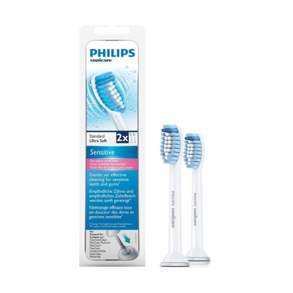 Glava četkice za zube Sonicare Sensitive tvrtke Philips ima iznimno mekana vlakna za nježno i učinkovito čišćenje. Posebno oblikovana vlakna odgovaraju obliku zuba i omogućavaju izuzetno nježno četkanje. Dostupna je i u manjoj, kompaktnoj veličini za precizno čišćenje.