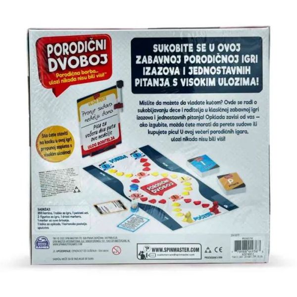 Set sadrži: 2 figurice - po jedna za suparničke timove, 110 kartica sa pitanjima - za roditelje i djecu, 50 kartica izazova i tablu za porodični dvoboj sa iscrtanim poljima.