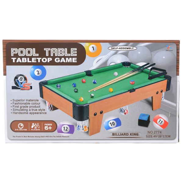 Set sadrži: bilijarski sto, 16 kuglica, 2 štapa, 1 kredu i trougao.