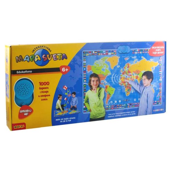 Interaktivna karta svijeta. Društvena igra za djecu stariju od 6 godina. Uz ovu kartu geografija je zabavna i lagana! Na karti su prikazane sve države svijeta od čega je 78 država interaktivno i pritiskom na zvjezdicu koja označava njen glavni grad saznat ćete ime države, njen glavni grad, službeni jezik, zastavu, regiju svijeta u kojoj se nalazi i jedni zabavnu činjenicu o toj državi.Možete igrati zabavnu igru znanja i takmičiti se.