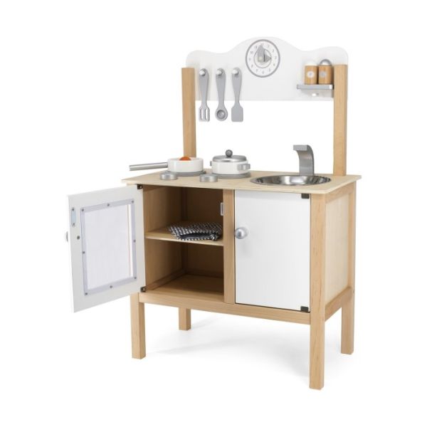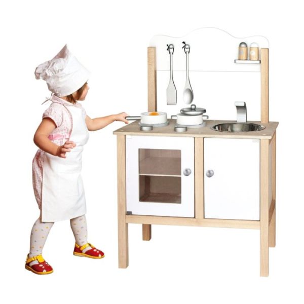 Neko želi da bude pekar, doktor, sportista...ali ako Vaša djevojčica uživa da gleda Vas u kuhinji onda je ovo sjajan poklon kojim će biti oduševljena. Kuhinja je napravljena od drveta i sadrži sve neophodne dodatke kao prava mini kuhinja. Tu su rerna, šerpe, poklopci, lonci čak i začini, lopatice i kašike za miješanje. Djevojčica će uživati u igri a ovakve igračke pozitivno djeluju na jačanje mašte ali i komunikativnih sposobnosti. Veličina kuhinje je oko 80 cm.