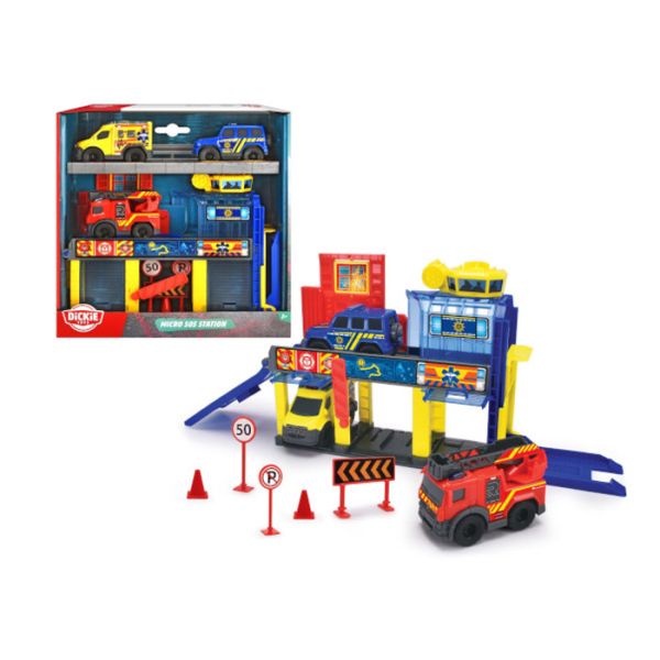 Igračka mikro stanica sa vozilima, rampom, liftom