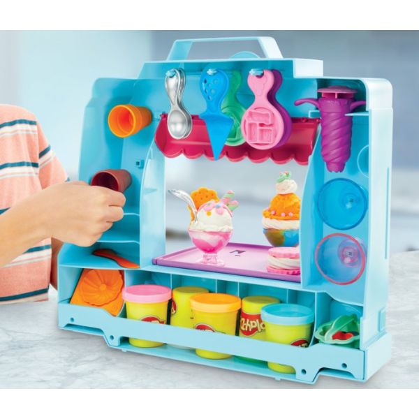 Set uključuje:štand za pravljenje sladoleda, modlice, kašike, i 5 kutijica plastelina u različitim bojama.