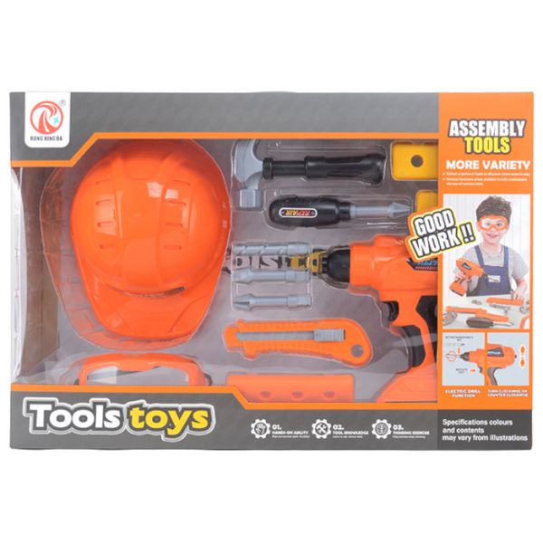 Set uključuje narandžasti šlem, električnu bušilicu, čekić, šrafciger i druge dodatke.