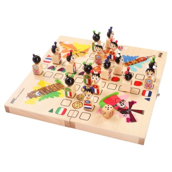 16 drvenih figurica različitih boja i dezena u obliku pirata kao i drvenu kockicu.