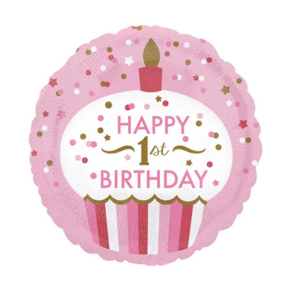 Klasični balon od folije "1st Birthday Cupcake Girl" okrugli hologramski 43 cm