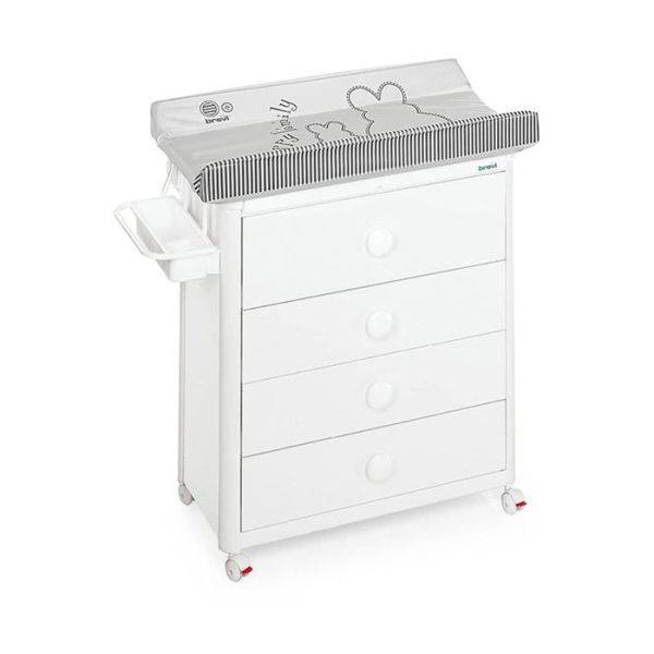 Praktična komoda za dječiju sobu u bijeloj boji ujedno je pogodna i za presvlačenje bebe sa mekom podlogom a unutar komode se nalazi i kadica za kupanje bebe kapaciteta 25l. Komoda je napravljena je drveta i obojena lakom zbog visokog sjaja.