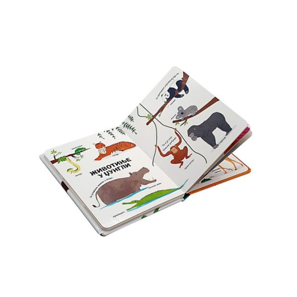 Uzmi svoju knjigu „za usput“ i uživaj u ilustracijama koje sadrže pojmove koje sa porodicom koristiš svakodnevno. U ovoj knjizi čekaju te kućni ljubimci, domaće životinje, šumske životinje, životinje koje žive pored vode, u savani, džungli, polarne životinje, ptice, morske životinje. Ova knjiga je uvod u rečnik svakog malog čitaoca i dovoljno je čvrsta da je ponese gde god i šta god da radi!