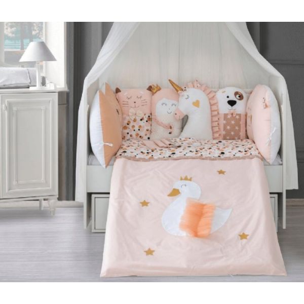 Set se sastoji od čaršafa, jorgana, jorganske navlake i mekih punjenih jastučića koji štite zidove ogradice.