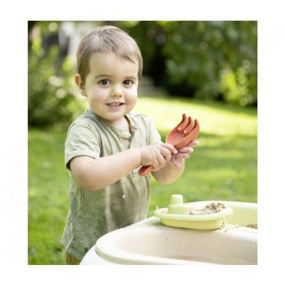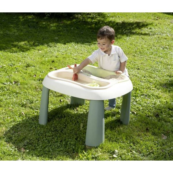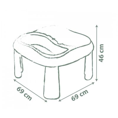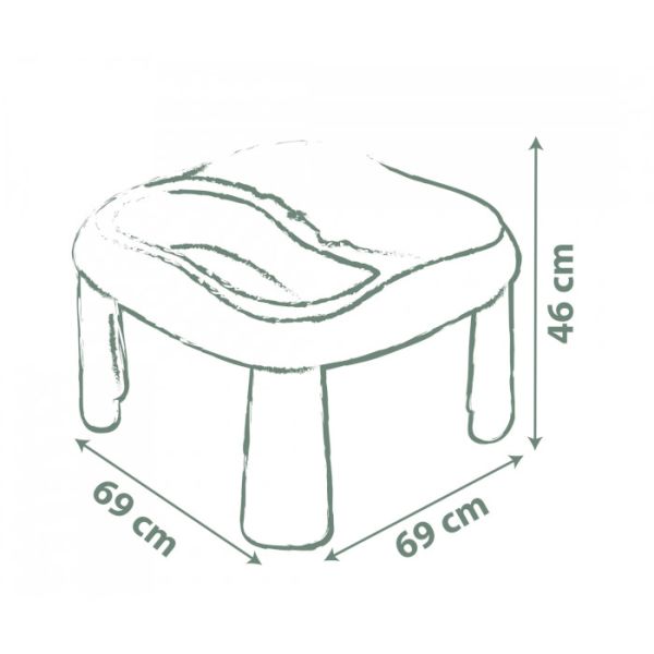 Stočić zauzima malo prostora pa je idealan za male prostore. Stočić posjeduje dva odvojiva plastična dijela za igru sa pijeskom.