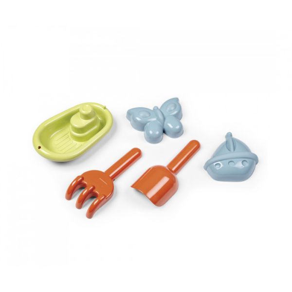 U set je uključeno i nekoliko dodataka: 1 lopata, 1 grablje, 2 kalupa za pijesak, 1 čamac.