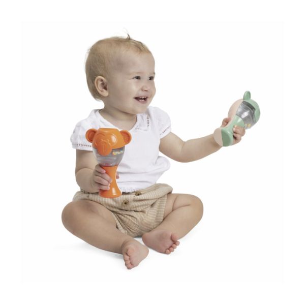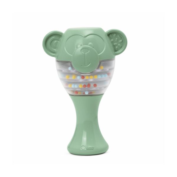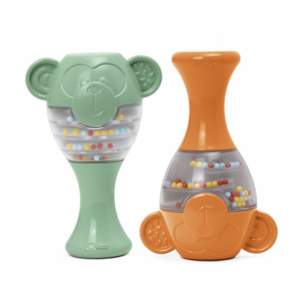 Chicco set se sastoji od dvije zvečke u obliku majmuna i unutar zvečke se nalaze kuglice koje prave zanimljive zvukove.