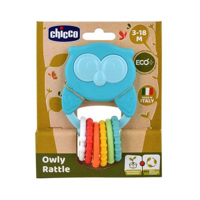 Chicco Eco zvečka u obliku sove je izuzetno zanimljiva zvečka u obliku sove. Zvečka je napravljena od 80% reciklirane plastike.Chicco Eco zvečka u obliku sove dio je Chicco ECO linije igračaka od reciklirane plastike i bioplastike. Igračka posjeduje 6 prstenčića i svaki dio glodalice fantastičan je kao pomoć bebi prilikom nicanja zubića i kod bolnih desni.